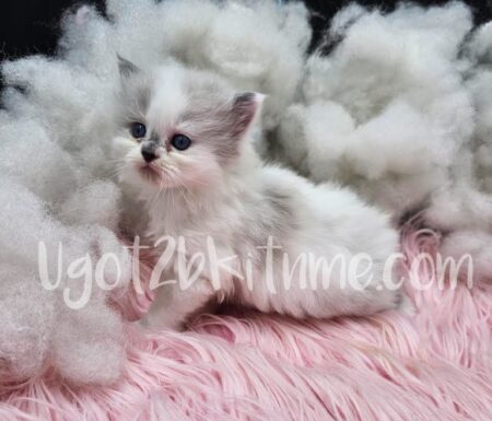 With his sky-blue eyes and soft cream coat, this blue bicolor Ragdoll boy looks like he was spun from a puff of sunshine and snow. He’s curious, gentle, and already has that signature Ragdoll sweetness that melts right into your arms.
