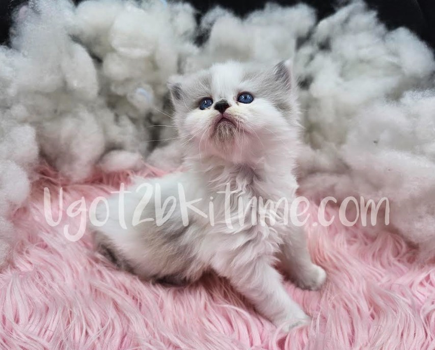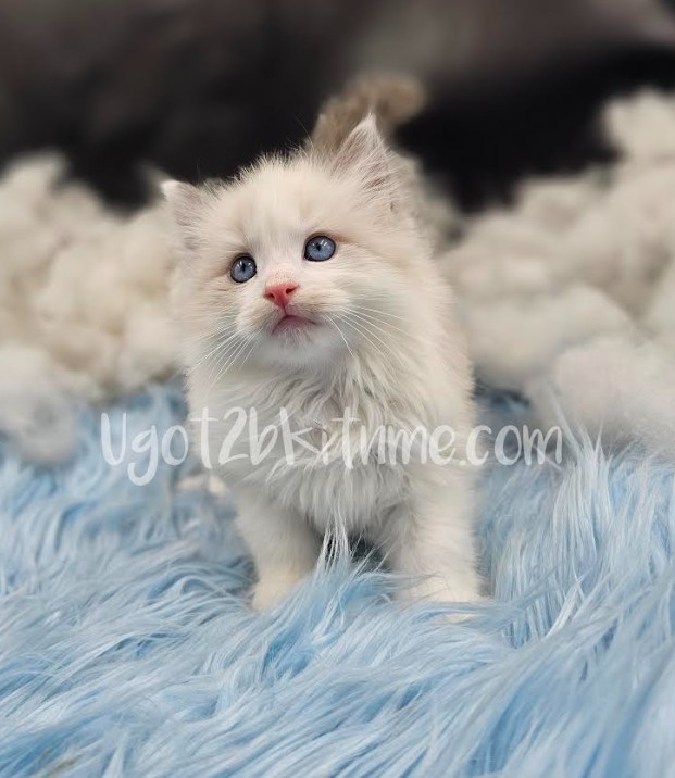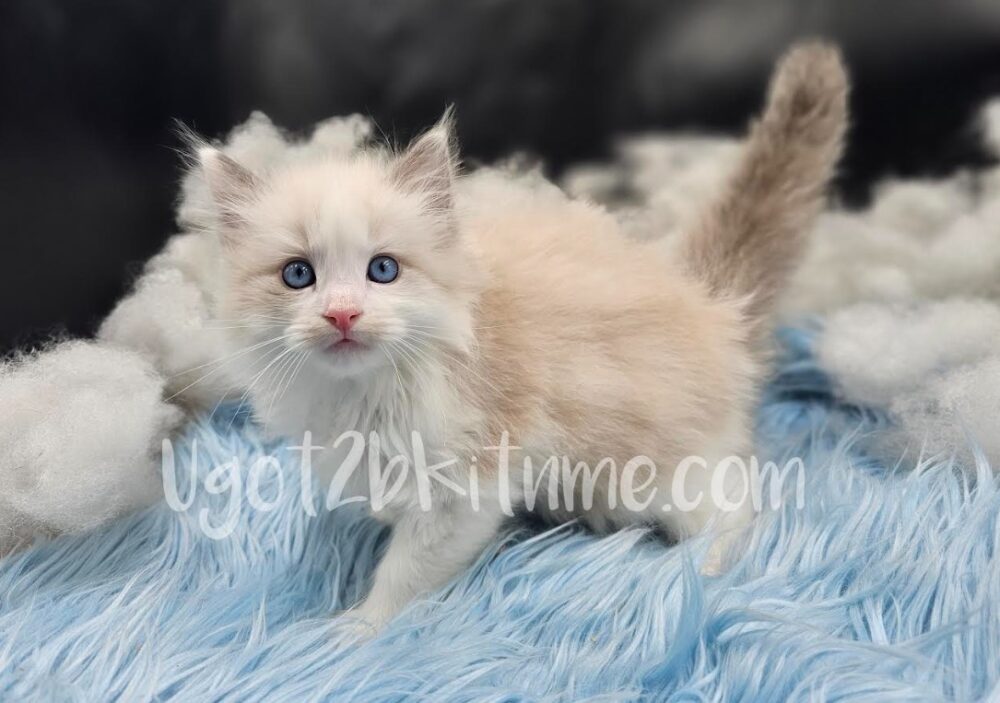 With his sky-blue eyes and soft cream coat, this blue bicolor Ragdoll boy looks like he was spun from a puff of sunshine and snow. He’s curious, gentle, and already has that signature Ragdoll sweetness that melts right into your arms.